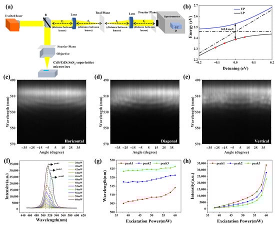 To identify the strong coupling regime of exciton–photon interaction, we comparatively study the ARPL spectra by ideal optical ARPL system with a 4-focal distance Fourier imaging configuration, as shown in Figure 3a. The experimental setup employs a 405 nm continuous-wave (CW) laser as the excitation source. The energy dispersion relations for the upper and lower polariton branches are derived from the angle-resolved photoluminescence (ARPL) spectra of CdS/CdS:SnS2 superlattice microwires using the coupled oscillator model, where the coupling strength is denoted as V and expressed as [,,,].