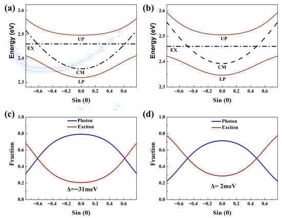 The properties of a polariton are primarily determined by its energy. When the polariton’s energy is closer to that of a photon, its properties are predominantly governed by the photon; when the polariton’s energy is closer to that of an exciton, its properties are predominantly governed by the exciton []. Since exciton–polaritons represent hybrid states of excitons and photons, the Hopfield coefficients obtained from fitting the lower polariton branch modes quantify the relative contributions of excitonic and photonic components within the polaritons []. Collectively, tuning the cavity–exciton detuning from positive to negative values transforms exciton-dominated exciton–polaritons into photon-dominated exciton–polariton states []. Based on theoretical fitting, we plot the single-mode polariton dispersion curves for CdS/CdS:SnS2 superlattice microwires with different hole excitation detunings of −31 meV and 2 meV, as shown in Figure 4a,b. Among them, the red curves represent theoretical fits for the upper and lower polariton branches, demonstrating how excitons and photons interact to form exciton–polaritons at varying detection angles. Here, the detuning () represents the energy difference between the cavity mode () energy and the exciton () energy () []. Respectively, the functional dependence of the Hopfield coefficients for the lower polariton branch on sin (θ) is presented in Figure 4c,d, where the cavity–exciton detuning energies are −31 meV and 2 meV. Concurrently, with increasing cavity–exciton detuning, the Hopfield coefficients reveal that the photonic fraction progressively dominates in the lower-branch exciton–polaritons at small angles. At a detuning of −31 meV, the lower polariton branch exhibits more photonic behavior at small angles, while at large angles, the exciton-to-photon ratio approaches 7:3. In comparison, for a detuning of 2 meV, the ratio approaches 4:1 at large angles. This demonstrates the angular and detuning dependencies of exciton–polaritons, wherein the present architecture provides a novel platform for investigating strong exciton–photon interactions.