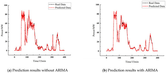 The introduction of this model during the preprocessing stage not only effectively reduces the potential random fluctuations in the data that could interfere with subsequent model training, but also enhances the stability and generalization capability of the neural network when learning temporal dependencies. The power prediction comparison chart before and after ARIMA noise reduction processing of the data is shown in