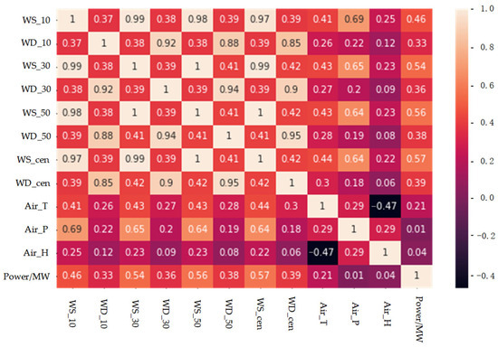 The characteristics are the dominant factors determining the accuracy of the predictive model. Therefore, it is essential to conduct an in-depth exploration of the meteorological features that are highly correlated with wind power generation, in order to construct more effective features. The relevant meteorological features are represented as , where (i = 1, 2, ⋯, n) represents the feature at the i-th moment, (k = 1, 2, ⋯, M) denotes the k-th feature among , n is the sample size, and M is the number of meteorological features. The feature construction is as follows: