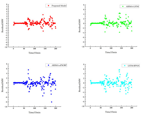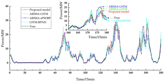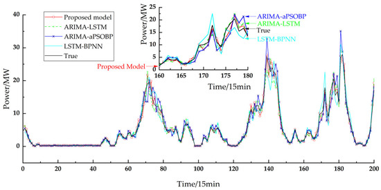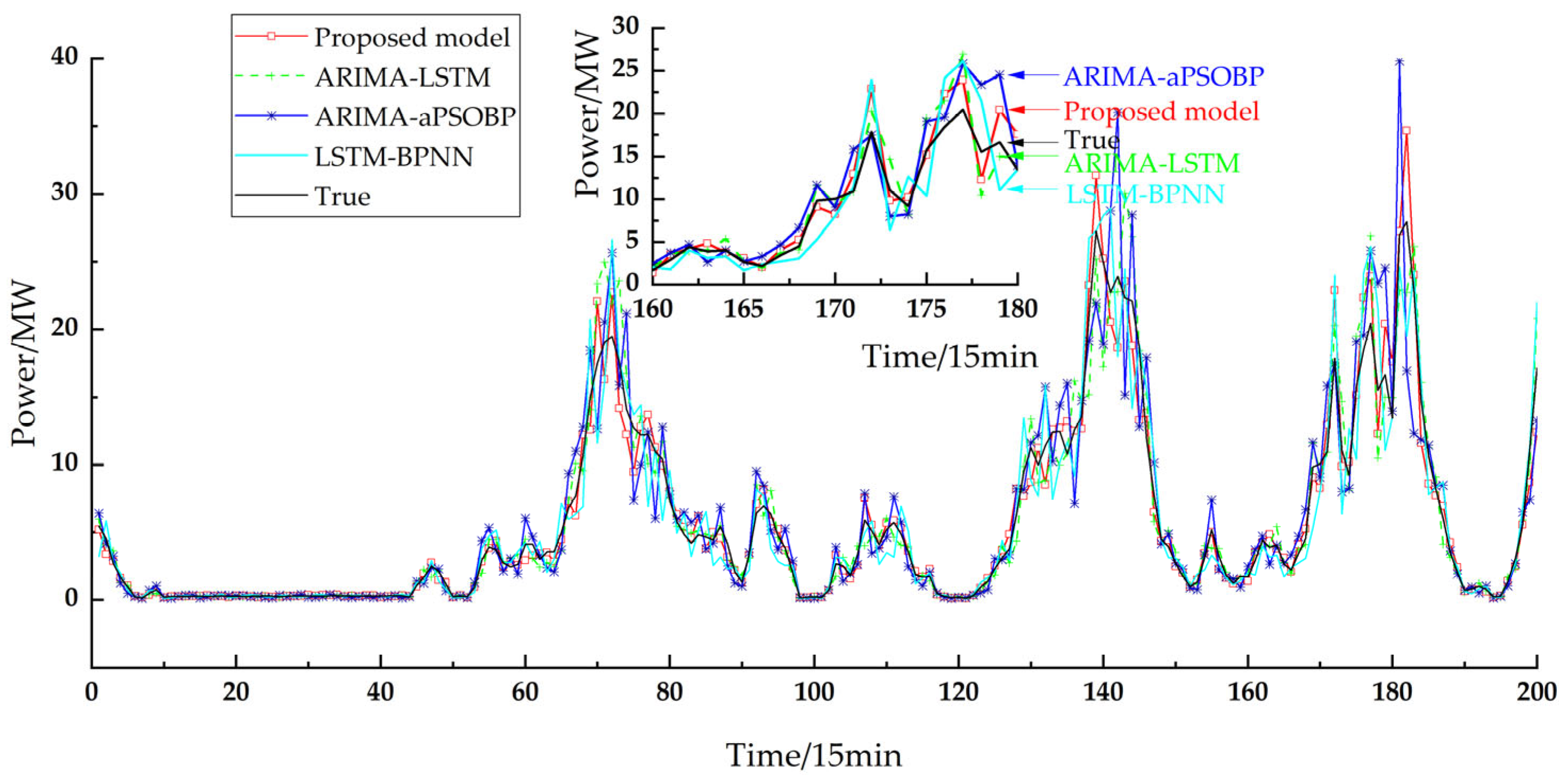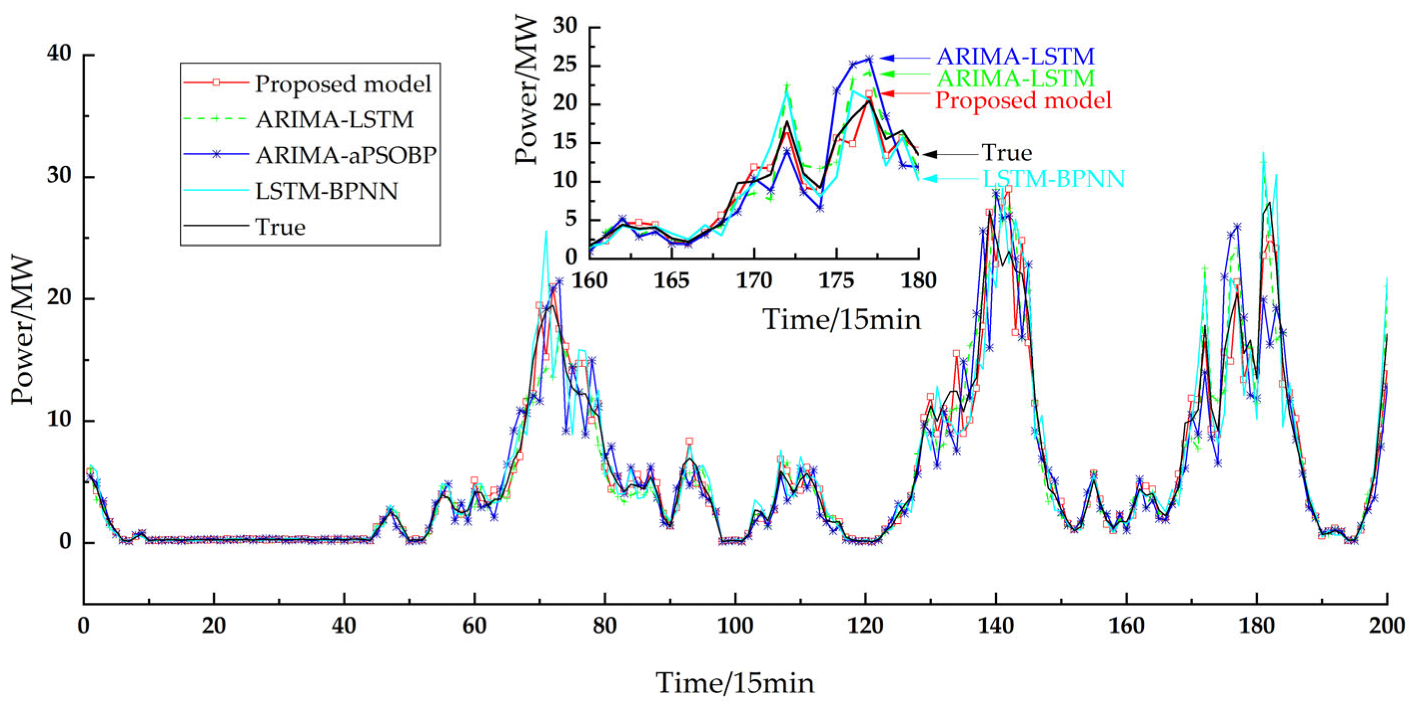Table 2. The full model (including ARIMA) and the ablation model (excluding ARIMA) were compared and validated under the same experimental conditions. The experimental results show that ARIMA preprocessing reduces the model’s mean absolute error (MAE) from 0.72 MW to 0.54 MW in one-step forecasts, a relative improvement of 25.0%, and the root mean square error (RMSE) from 1.25 MW to 0.90 MW, a relative improvement of 28.0%. In multi-step forecasting scenarios, the complete model demonstrates superior error control capabilities.