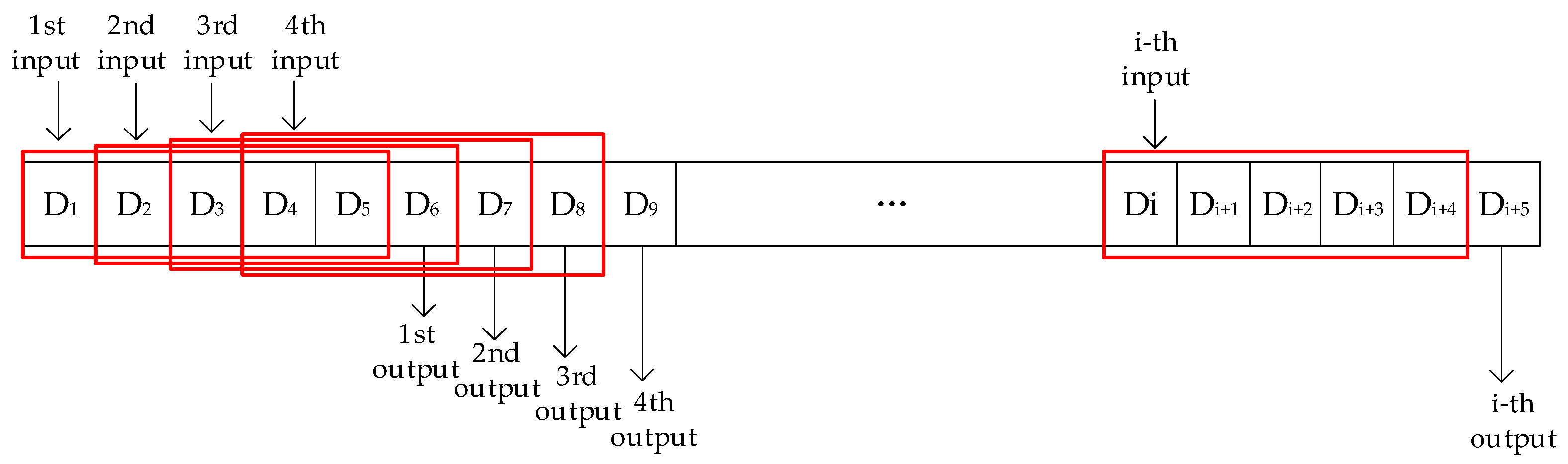 In Equation (9), the terms and on the left-hand side represent the average, standard deviation, and maximum value of the k-th feature within the time window , respectively. The parameter defines the size of this window.