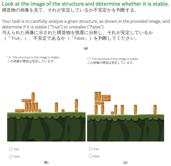 Task 1 consisted of 10 questions, evenly split between 5 stable and 5 unstable structures. The corresponding instruction and example questions are illustrated in Figure 1, where panel (a) shows the instruction provided to participants and panels (b) and (c) present sample questions depicting a stable and an unstable structure, respectively. Task 2 followed a similar set, also comprising 10 questions balanced across stable and unstable conditions, but with the addition of a four-option multiple-choice format based on images. Task 3 was designed to cover three distinct subtasks (“diff_block”, “diff_id”, and “diff_level”), selecting 5 questions for each subtask, resulting in a total of 15 questions. This careful selection process ensures that the experimental design is both challenging and representative of the dataset, enabling meaningful evaluation of human performance relative to multimodal models. The example instructions and questions for Tasks 2 and 3 are provided in the repository.