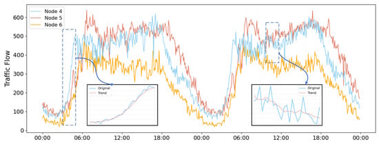 Traffic flow for Nodes 4, 5, and 6 in the PeMS08 dataset over two consecutive days. The main plots show that spatial correlations among nodes remain generally stable over long periods, while both spatial and temporal dimensions exhibit pronounced short-term fluctuations. Off-peak hours are dominated by high-frequency variations, whereas peak and valley periods are characterized by rapid increases and decreases in flow, respectively. Insets display representative segments, comparing the original series with its smoothed trend component to highlight long-term patterns and short-term fluctuations.
