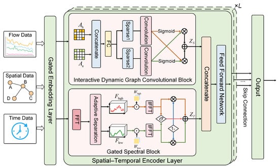 The overall architecture of FISTGCN is illustrated in Figure 2. After the gated embedding layer aggregates the traffic flow data with spatial and temporal embeddings, multiple spatial-temporal encoder layers are employed to extract spatial-temporal patterns, which are then passed to the output layer for final prediction. The detailed implementation of each module will be comprehensively introduced in the following subsections.