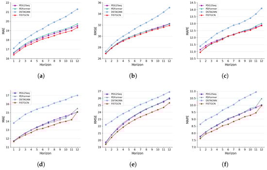 To comprehensively evaluate the models’ performance across different prediction horizons, the future 12-step predictions of the PDG2Seq, PDFormer, DSTAGNN, and FISTGCN models are compared, with the corresponding MAE, RMSE, and MAPE reported and plotted, as shown in Figure 3. As observed, FISTGCN achieves the best results across all prediction lengths and evaluation metrics. As the prediction horizon increases, the MAE, RMSE, and MAPE for all models increase, reflecting the greater difficulty of long-term forecasting. While FISTGCN performs comparably to the state-of-the-art PDG2Seq in short-term predictions, it demonstrates a clear advantage in long-term forecasting scenarios.