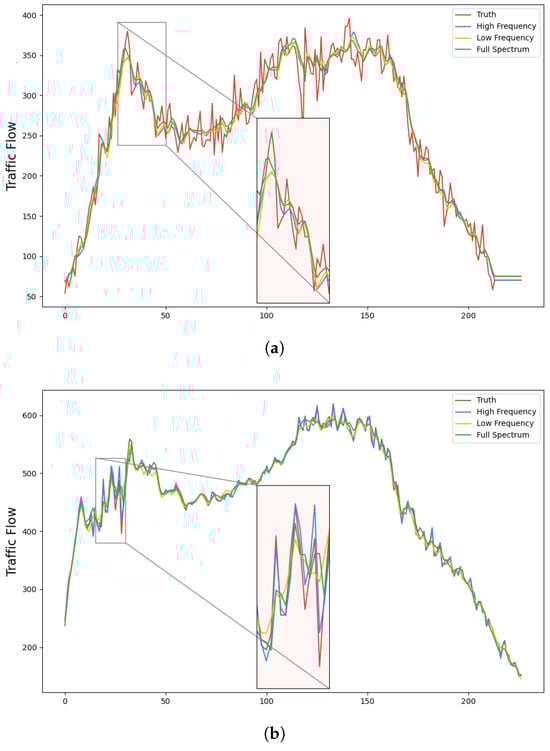 Visualization of visual comparison of prediction results for different inputs. (a) Visualization of real and predicted traffic flow at node 10 on PeMS04; (b) visualization of real and predicted traffic flow at node 49 on PeMS08.