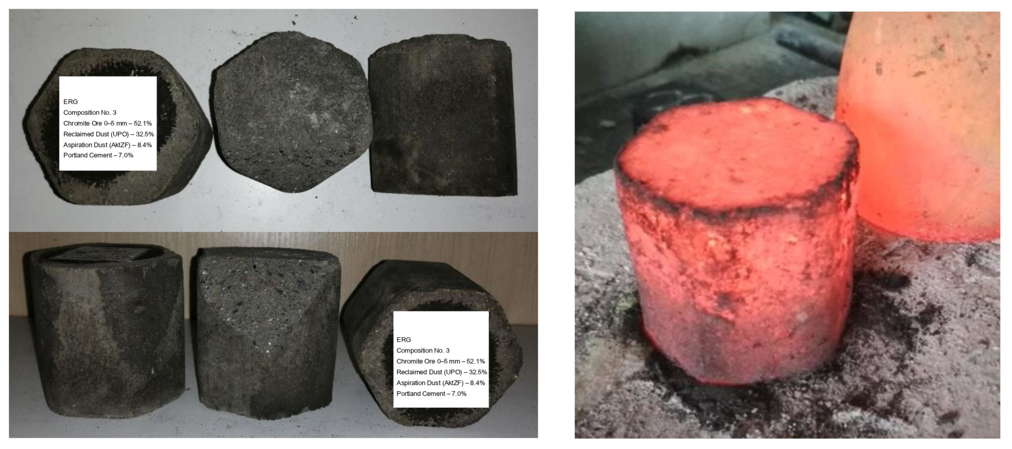 - Sariyev, O.; Almagambetov, M.; Nurgali, N.; Abikenova, G.; Kelamanov, B.; Yessengaliyev, D.; Abdirashit, A. Development of a Briquetting Method for Dust from High-Carbon Ferrochrome (HC FeCr) Crushing Using Vibropressing on an Industrial Scale and Its Subsequent Remelting. Materials 2025, 18, 2608. [Google Scholar] [CrossRef] [PubMed]