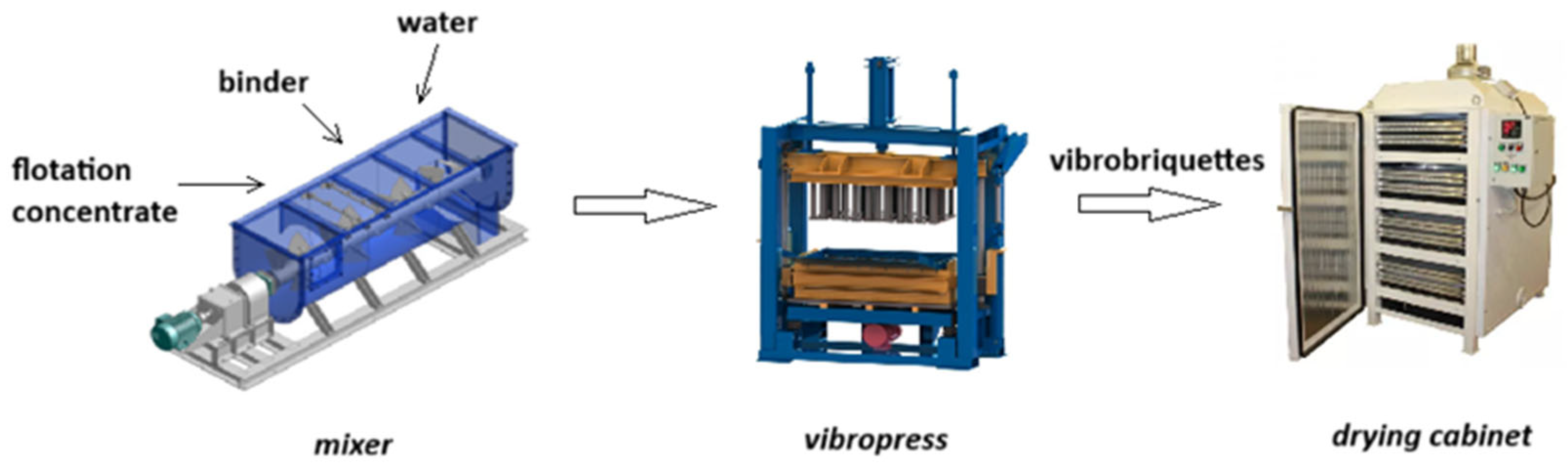 Therefore, the aim of this study is the development and pilot-scale testing of vibro-briquetting technology for flotation concentrates and fine chromite-bearing raw materials accumulated at ERG enterprises. For this purpose, a project was initiated at the LLP “ERG Research and Engineering Center” to agglomerate fine and ultrafine chromite fractions, which included the following objectives:
