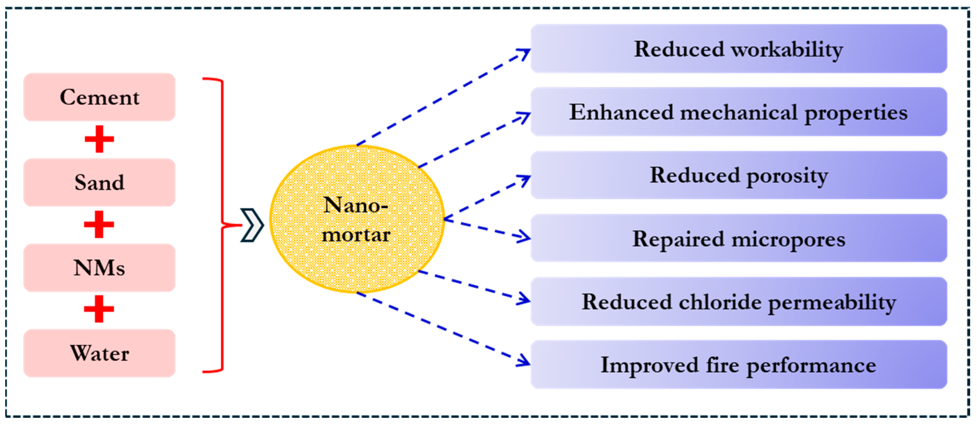 - Monteiro, H.; Moura, B.; Soares, N. Advancements in Nano-Enabled Cement and Concrete: Innovative Properties and Environmental Implications. J. Build. Eng. 2022, 56, 104736. [Google Scholar] [CrossRef]