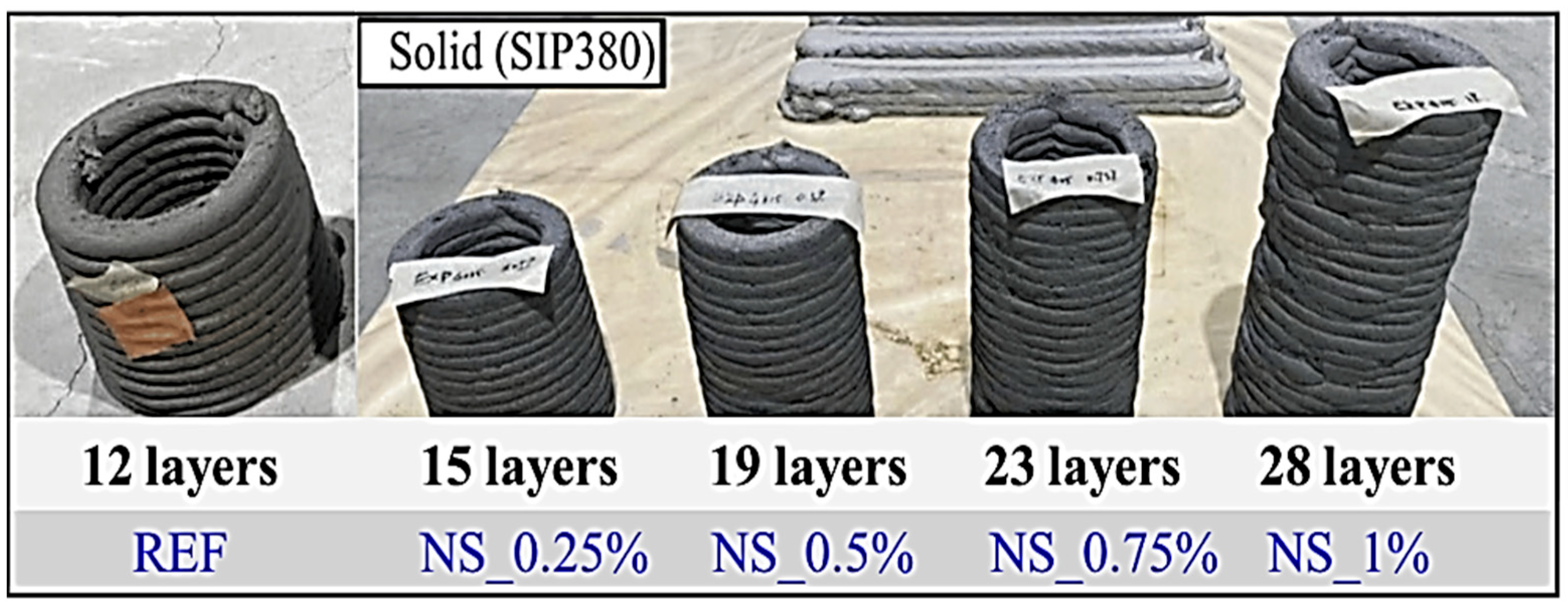- Xu, P.; Chen, T.; Fan, K.; Zhang, M. Effect of Nano-Silica Sol Dosage on the Properties of 3D-Printed Concrete. J. Build. Eng. 2023, 80, 108090. [Google Scholar] [CrossRef]
