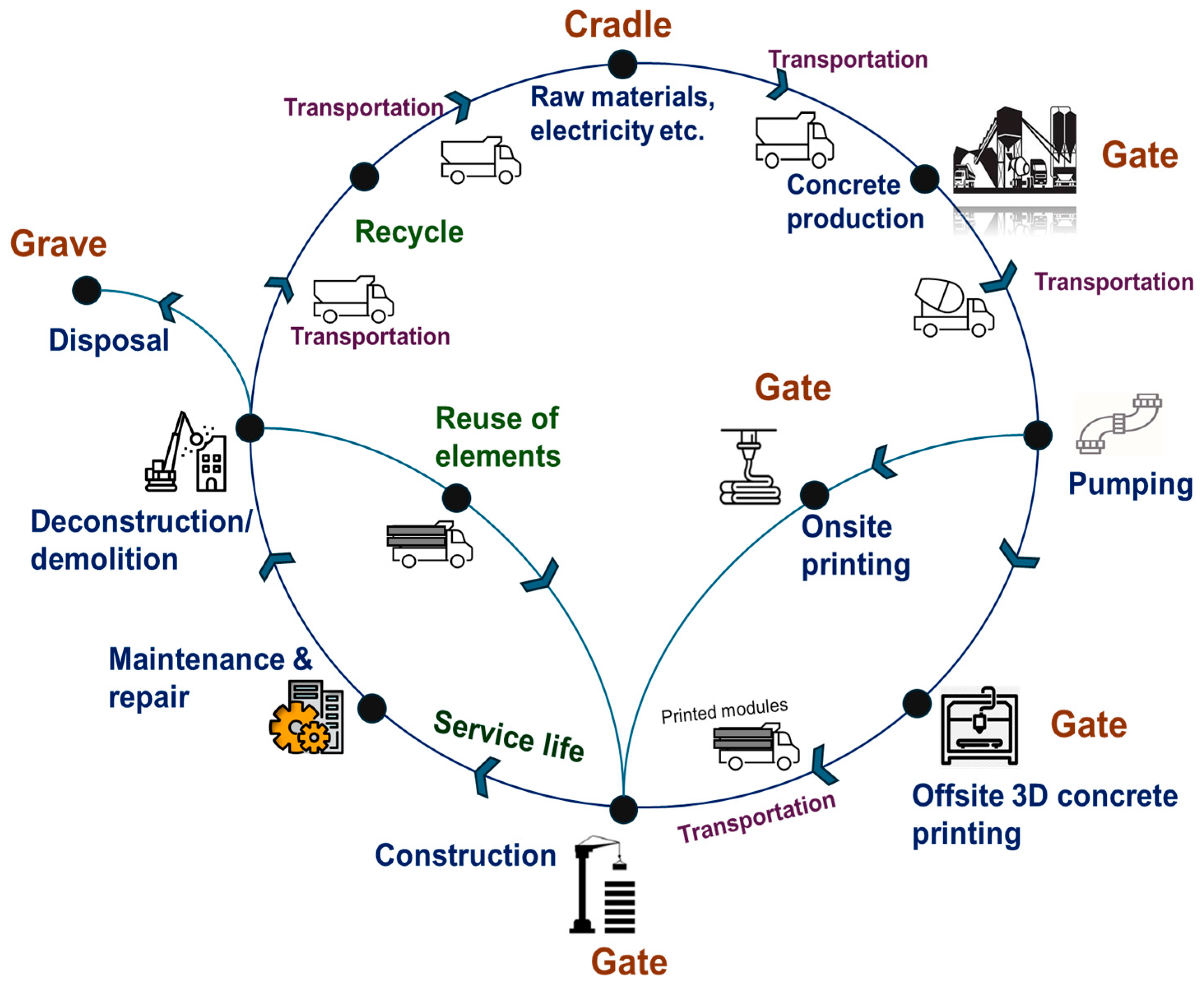 - Motalebi, A.; Khondoker, M.A.H.; Kabir, G. A Systematic Review of Life Cycle Assessments of 3D Concrete Printing. Sustain. Oper. Comput. 2024, 5, 41–50. [Google Scholar] [CrossRef]