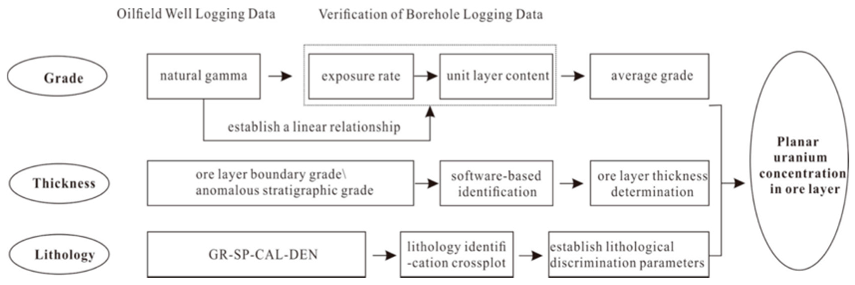 - Yu, R.A.; Sun, D.P.; Zhou, X.X.; Deng, F.; Si, Q.H.; Hu, Y.X. Preliminary investigation of uranium resource evaluation method based on natural gamma logging data: A case study of the Pengyang uranium deposit in Ordos Basin. Coal Geol. Explor. 2022, 50, 144–152, (In Chinese with English Abstract). [Google Scholar]