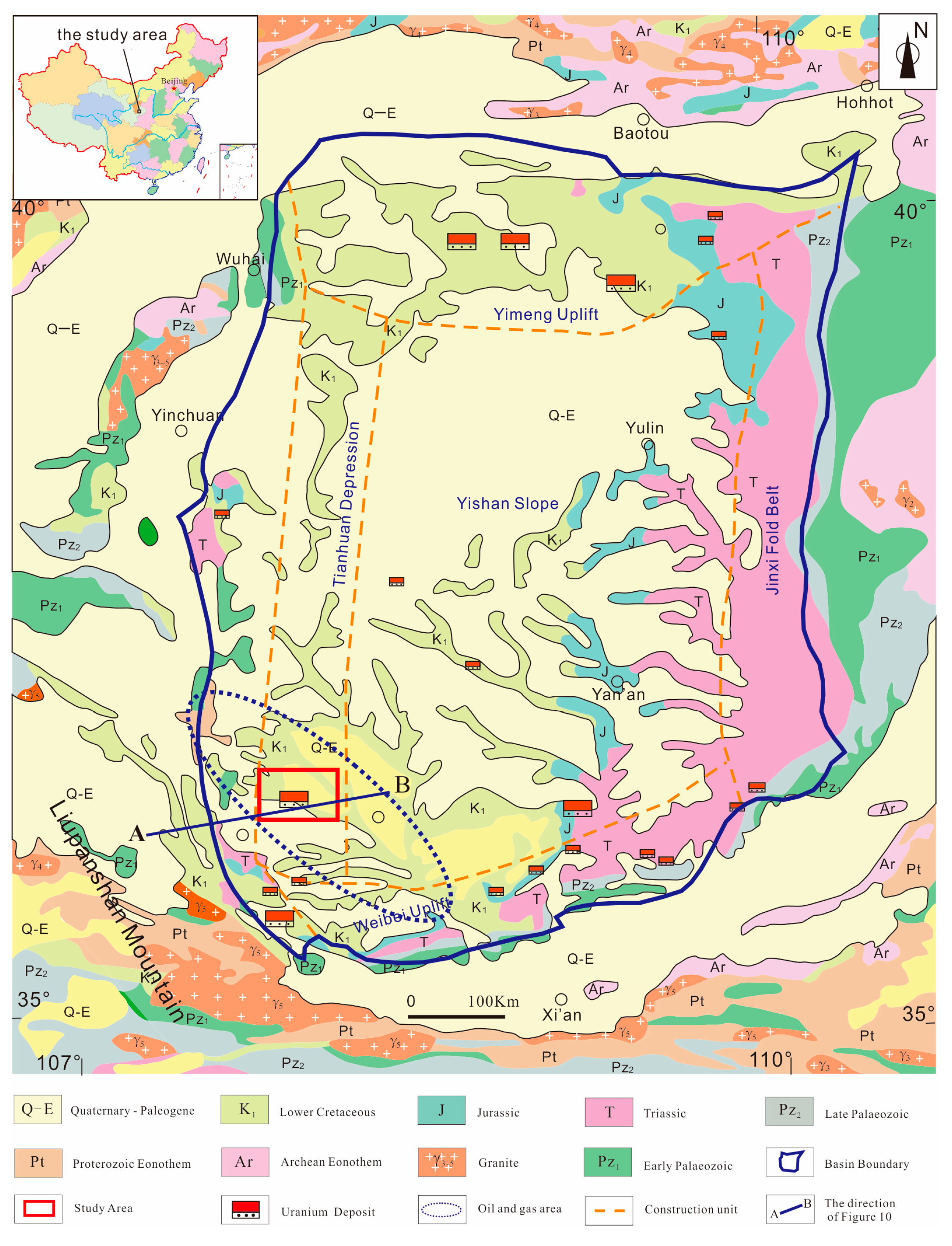 - Jin, R.S.; Teng, X.M. Large scale sandstone-type uranium mineralization in northern China. North China Geol. 2022, 45, 42–57, (In Chinese with English Abstract). [Google Scholar]