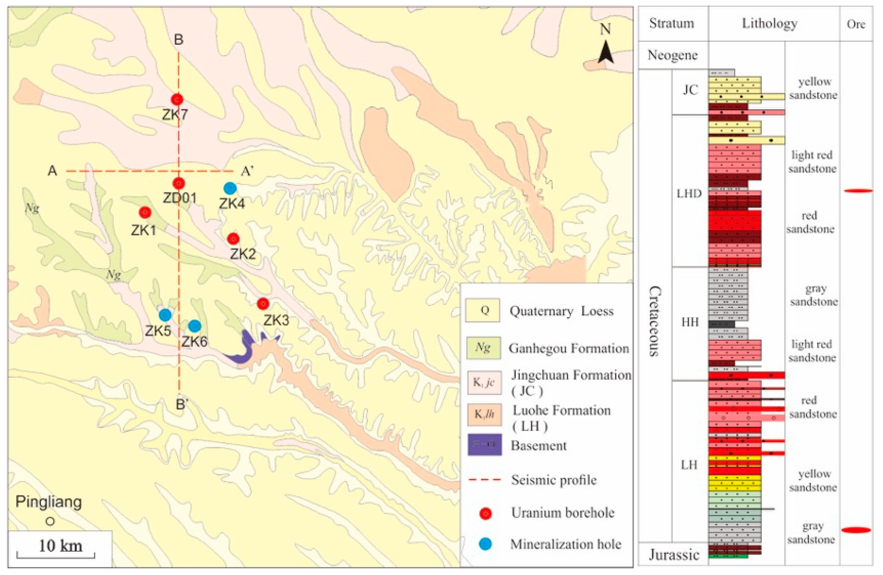 - Jin, R.S.; Zhu, Q. Supernormal enrichment mechanism and metallogenic process of sandstone type uranium deposit in the eolian sedimentary system in Jingchuan area, Ordos basin. Acta Geol. Sin. 2023, 97, 725–737, (In Chinese with English Abstract). [Google Scholar]
