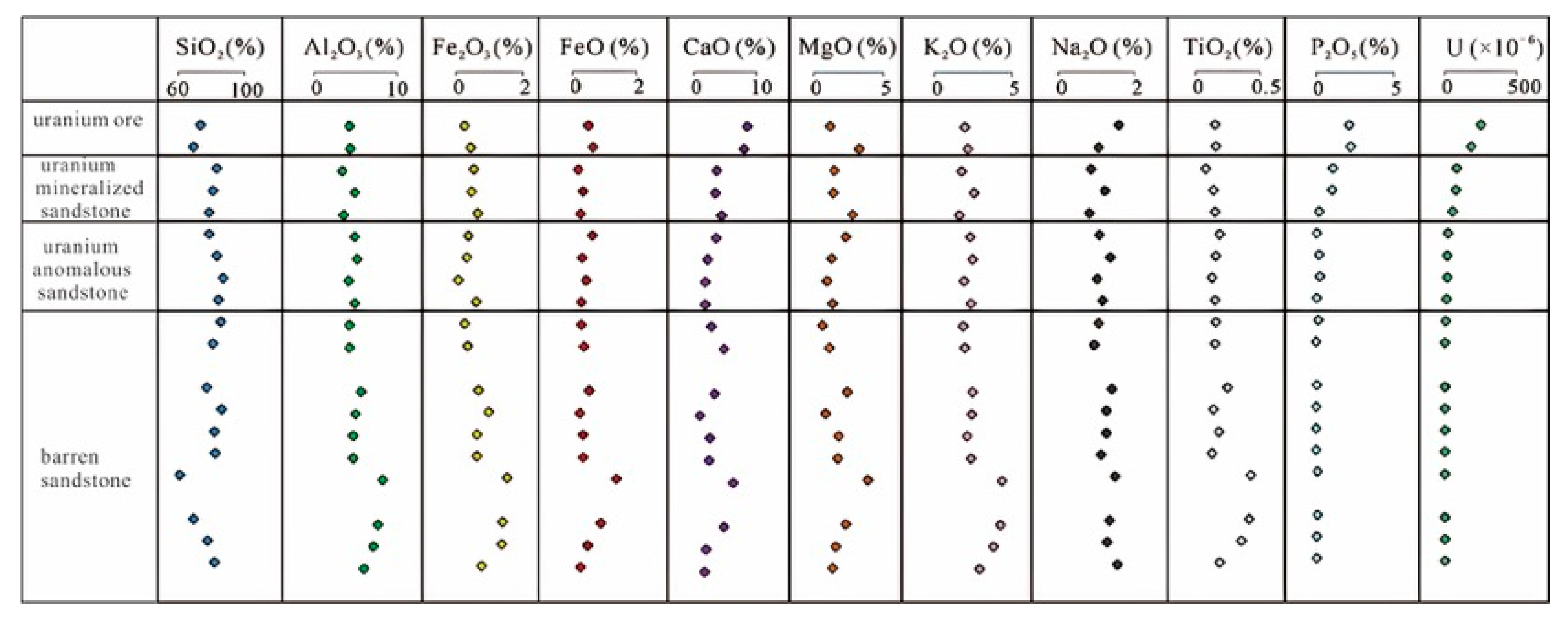 - Jin, R.S.; Miao, P.S.; Sima, X.Z.; Yu, R.A.; Cheng, Y.H.; Tang, C.; Zhang, T.F.; Ao, C.; Teng, X.M. New prospecting progress using information and big data of coal and oil exploration holes on sandstone-type uranium deposit in North China. China Geol. 2018, 1, 167–168. [Google Scholar] [CrossRef]