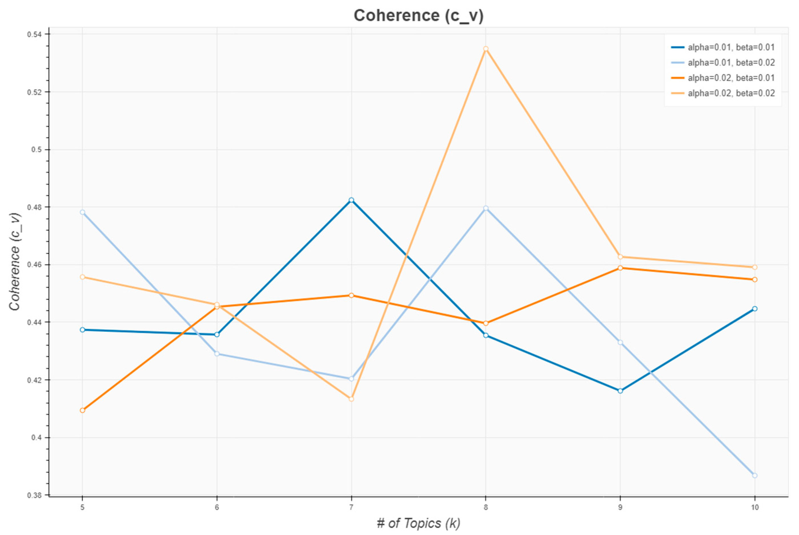 - Hagen, L. Content Analysis of E-Petitions with Topic Modeling: How to Train and Evaluate LDA Models? Inf. Process. Manag. 2018, 54, 1292–1307. [Google Scholar] [CrossRef]