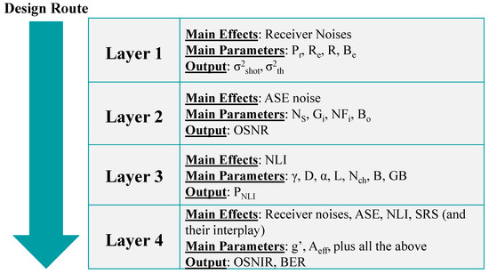 Overall, the main novelties of this work are as follows: (i) to the best of our knowledge, this is the first work that proposes a layered approach for the design of optical networks where it introduces four layers, each dealing with different effects. This approach allows for the focused study and modeling of each impairment (first three layers) and also for the examination of the combined impact of all effects (fourth layer); (ii) educational innovation: This is the first work that introduces the layered approach in the field of optical networks aiming to improve and simplify the educational process by allowing students to better comprehend complex network behaviors by decomposing them into comprehensible layers, fostering improved understanding, active learning and self-acquired skills.
