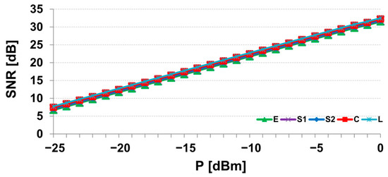 Figure 2 illustrates the SNR for different values of the received optical power. In this figure, the impact of only shot and thermal noise is included, defining the theoretical minimum received power (P) to achieve a target performance in terms of SNR in a multi-band optical system. This figure demonstrates that the SNR increases linearly as a function of received channel power (P) across all spectral bands (E, S1, S2, C, L), showing a difference between the channels in different bands, mainly due to the fact that the responsivity is wavelength dependent. The analysis indicates that a received optical power of more than −20 dBm can ensure sufficient performance in terms of SNR. By having our first layer refer only to the receiver noises, a clear reference point for subsequent layer analysis is established, namely, before introducing the complexity of ASE noise, NLI effects, and SRS in the next layers. Such a stepwise approach is essential for building intuition and for the evaluation of the physical impairments an ultra-wideband optical network can face.