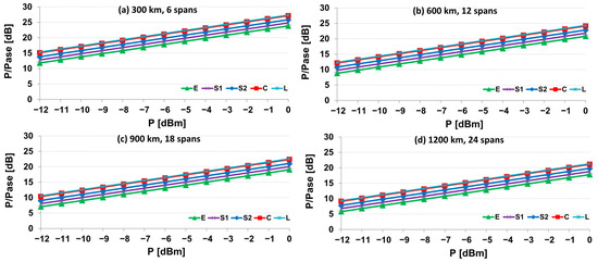 This layer estimates the impact of ASE noise on four different distances, from 300 to 1200 km, with an incremental step of 300 km. Figure 3 illustrates the P/PASE versus P for the five different sub-bands. We can observe that as the number of spans increases, the P/PASE ratio decreases linearly for all the bands, as ASE noise accumulates linearly with the number of spans since the signal traverses more amplifiers. By comparing the various bands in the plots in Figure 3, it is revealed that the L band achieves the highest P/PASE values, while the E band has the lowest ones, which can be attributed to the higher fiber attenuation in the E band and consequently to the larger required amplification gain that leads to greater ASE noise. The linear dependence of P/PASE on launch power, while excluding nonlinearities and SRS, makes it clear that ASE noise is the dominant physical layer constraint, compared with shot and thermal noise, indicating a minimum of about −8 dBm in E and S bands and about −11 dBm in C and L bands in order to overcome its impact.