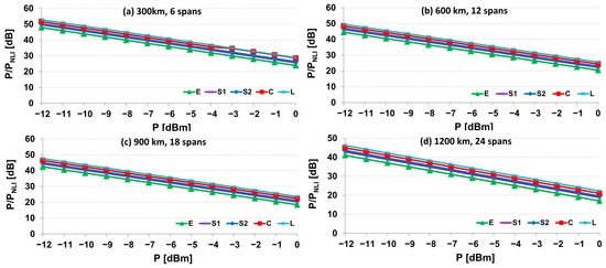 In this layer, the impact of NLI is quantified. Figure 4 illustrates the P/PNLI for the same transmission distances as the previous sub-section. As is evident, the system performance decreases as the launch power increases. This is expected from the expression of Equation (4), where the NLI power is proportional to the cube of the optical power, and as a result, the OSNIR degrades at higher power levels, e.g., after 0 dBm. In addition, for a given launch power, the P/PNLI ratio decreases as the number of spans increases, reflecting the cumulative buildup of the NLI over long transmission distances. We can also observe that the power of NLI is higher at lower wavelengths, as the chromatic dispersion parameter D(λ) is increasing with the wavelength and the PNLI is inversely proportional to D(λ), as presented in Equation (4).