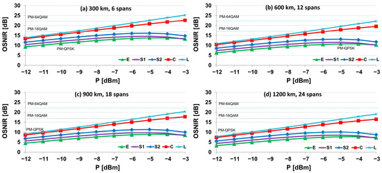OSNIR versus transmitted optical power for each band at different transmission distances. The required OSNIR that leads to a target BER of 10−3 is also designated (9.8, 16.55, and 22.5 dB for PM-QPSK, PM-16QAM and PM-64QAM, respectively).