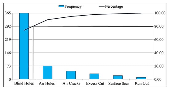 Defective parts can create life safety risks and property damage. In WAAM Ti 6Al 4V, internal gas pores sharply reduce fatigue life, and the largest pores, especially when they are near the surface, tend to control failure, consistent with a notch fatigue factor of about 1.5 and a notch sensitivity of about 0.5 [18]. For WAAM Alloy 718 with crack-like planar defects, the apparent fracture toughness becomes directional, where a notch perpendicular to the defect planes is comparable to wrought material whereas a notch parallel to the planes drops to roughly one half of the wrought value [19]. In practical terms, the size, position, and orientation of the defects can lower fatigue and fracture margins to levels that threaten structural integrity and safety. Therefore, ensuring in-process quality and investigating the root cause of defects should be primary requirements for WAAM parts, with quality controls applied during production, quantitative inspection of any indications, and corrective actions to ensure the final product meets requirements. DMAIC (Define, Measure, Analyze, Improve, and Control) is a suitable method to ensure defect-free production of WAAM manufactured parts. In a case study, Nallusamy et al. showed that DMAIC can turn NDE (non-destructive evaluation) data into process improvement by organizing ultrasonic and radiographic findings into severity and frequency charts to prioritize issues, as shown in Figure 2. Detailed process mapping then identified the source of the defects, after which the problematic part was replaced with a redesigned component. Finally, continued NDE verified that production remained free of defects [20].