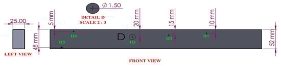 Prior to inspecting the WAAM specimen, the repeatability of the PAUT system was verified using a calibration block (Figure 5) which was fabricated by following AWS D 1.5 guidelines. The block contained side-drilled holes of 1.5 mm in diameter at multiple depths from the scan surface. Each hole was scanned and sized three times to collect the required mean dB gain so that standard deviation analysis could be calculated to verify the system’s reliability and repeatability for defect inspection. The technical details of the calibration block are demonstrated in Table 4 below.