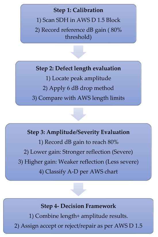 By combining length-based sizing with amplitude-based severity classification, this method provided a dual-criteria framework that accounts for both physical extent and reflectivity of the porosity. This ensured repeatable, code-compliant decisions for acceptance or repair of WAAM components in line with AWS D 1.5. Figure 6 summarizes the defect evaluation flowchart methodology below.