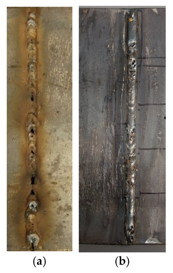 Visual inspection of the WAAM specimen: (a) after root pass, showing early pore formation, and (b) after three passes, with visible porosity clusters confirming successful defect seeding.