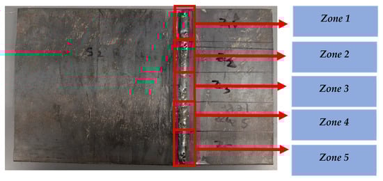 To study how porosity was distributed along the 180 mm WAAM specimen, the bead was split into five zones of about 36 mm each (Z1–Z5, Figure 8). Porosity in WAAM is rarely uniform; start–stop points of the arc and changes in heat flow can make some regions worse than others. The five-zone approach also follows the AWS D1.5 requirement to check 25 mm segments for acceptance. During visual inspection, pores appeared more concentrated in certain areas of the bead, so looking at localized sections gave a clearer picture of this variability.