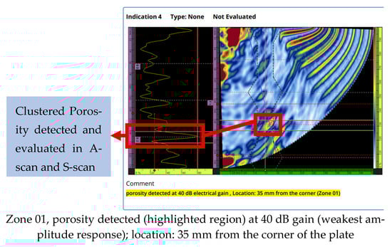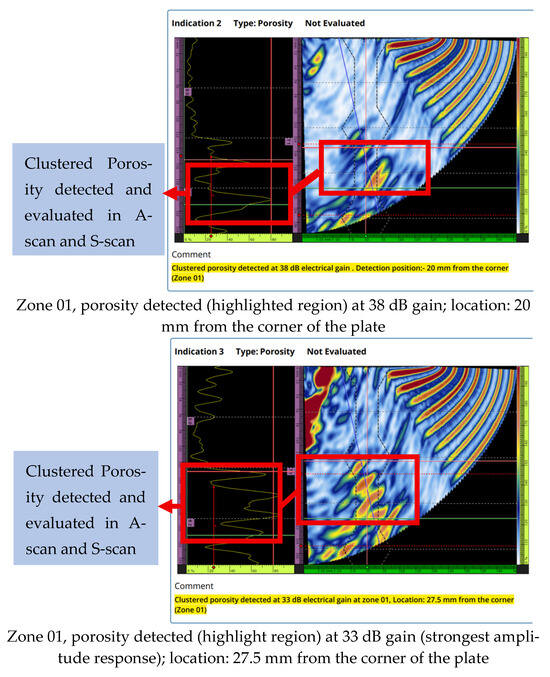 In Zone 1 (0–36 mm) (Figure 9), the strongest porosity reflection was recorded 27.5 mm from the corner, requiring 33 dB gain to reach the 80% amplitude threshold. From this point, the probe was moved left and right to identify the 6 dB drop positions. At 20 mm from the corner (Figure 9), the porosity was detected at 38 dB gain, about 5 dB higher than the peak. No further reliable signals were observed on the left side, so this location was taken as the start of the porosity distribution. On the right side, at 35 mm from the corner, the porosity was detected at 40 dB gain (Figure 9). Based on these boundaries, the total porosity length in Zone 1 was measured as 15 mm.