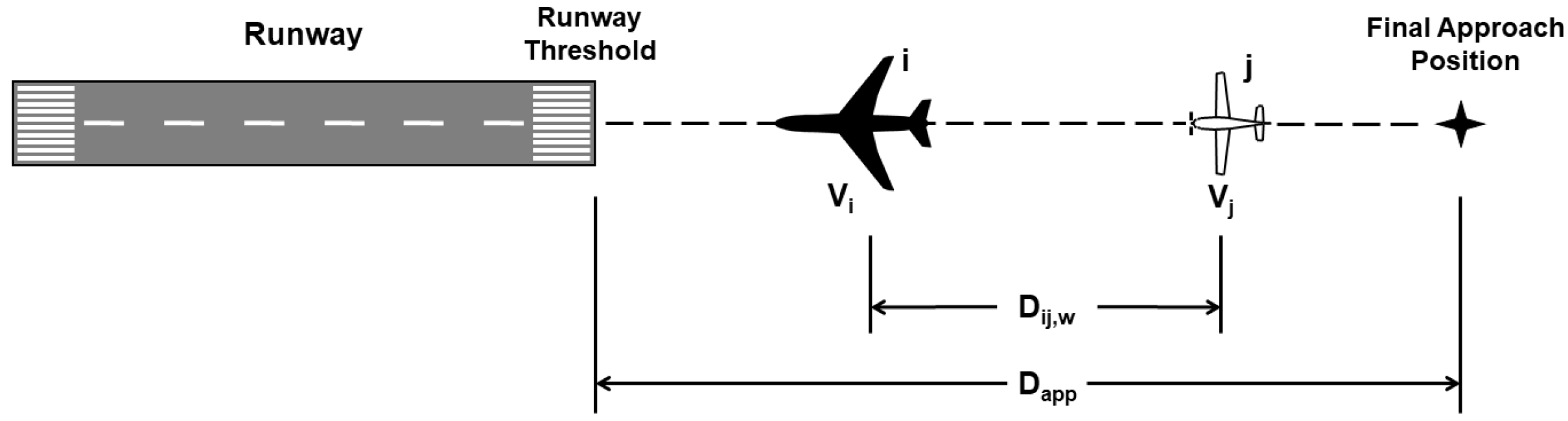 ij,w represents the minimum wake safety separation between the two approaching aircraft, V