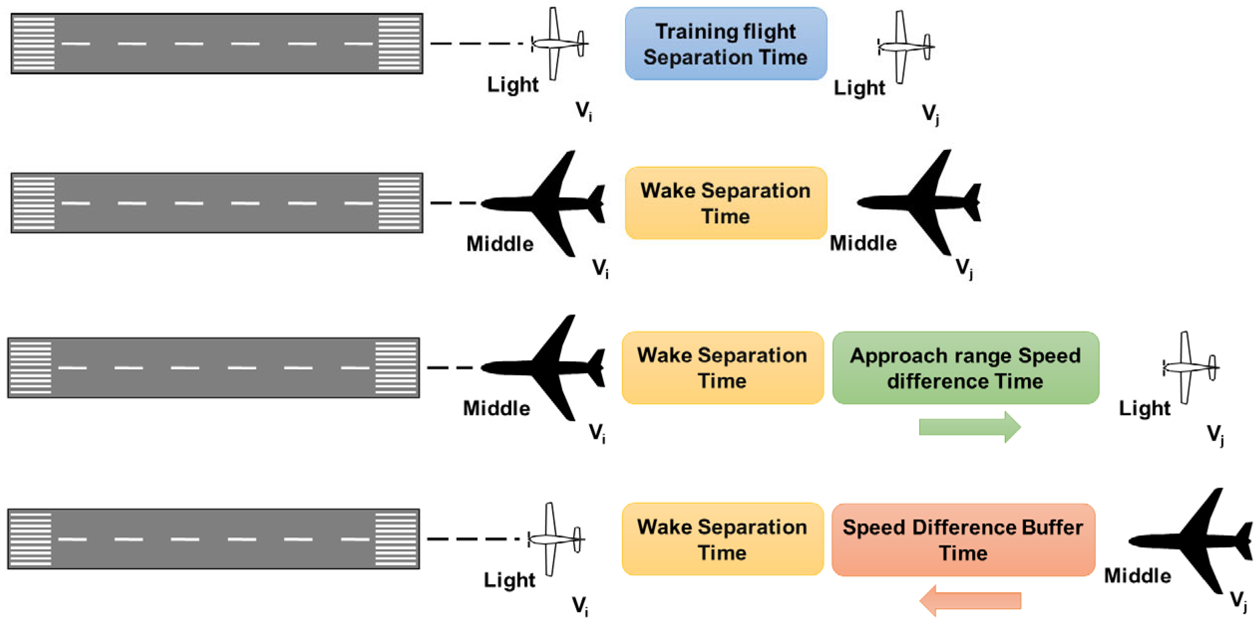 Figure 4, different approach scenarios are illustrated. The approach speed of medium aircraft performing civil aviation transport operations is higher than that of light aircraft engaged in training flights. When a light aircraft is the leading aircraft, the speed difference results in a “catch-up” effect in the final approach segment, causing the relative separation between the two aircraft to gradually decrease over time. To address this effect, the RASR between the leading and following aircraft is adjusted to compensate for the reduction in spatial wake separation caused by the speed difference. A time buffer term is introduced to ensure operational safety. Conversely, when the leading aircraft is a medium aircraft, the speed difference increases the temporal separation between the two aircraft during the approach phase. The separation between the two aircraft during the approach phase is calculated as shown in the following: