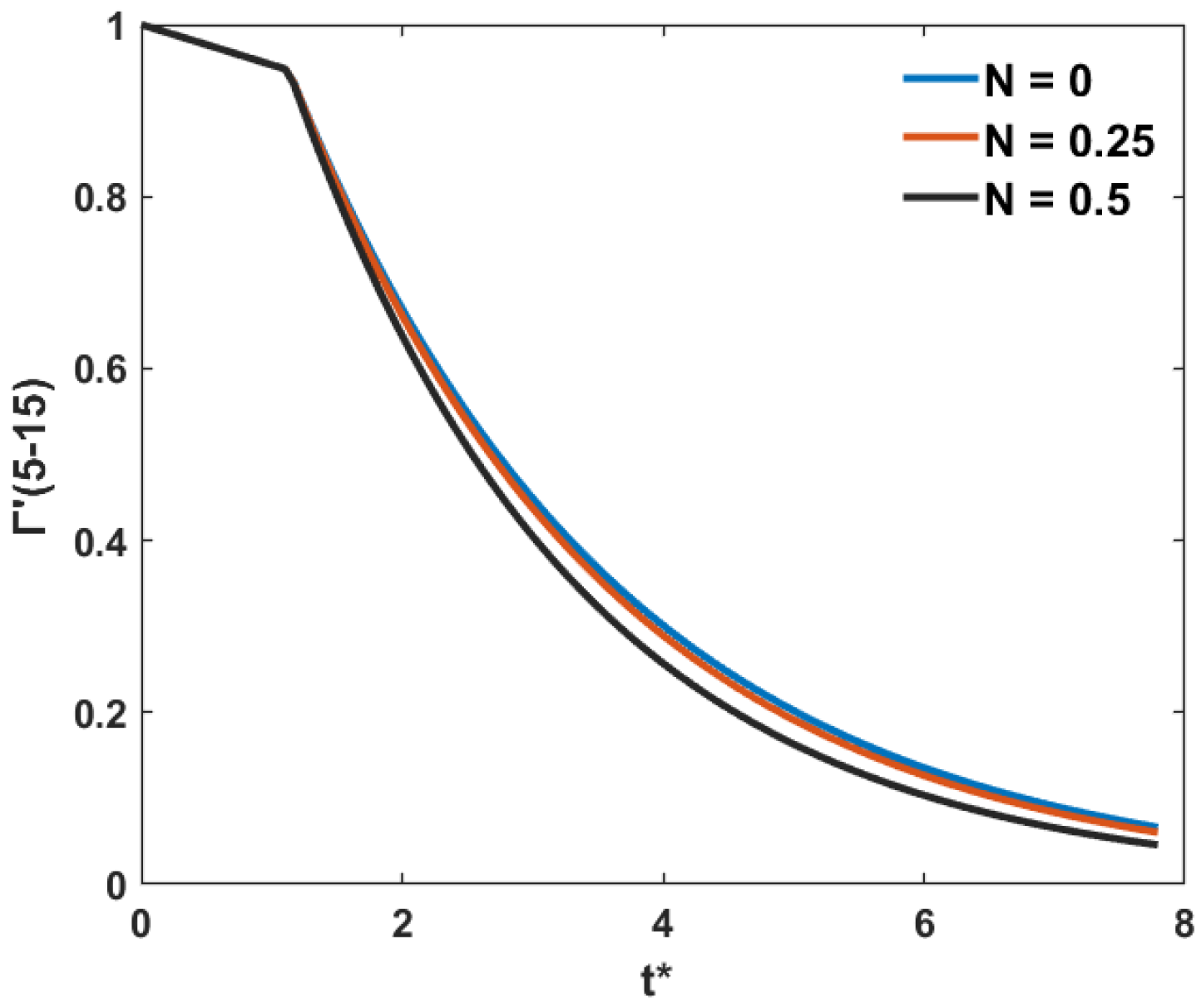 0 represents the initial circulation of the wake vortex. After the dissipation in the near-field phase, the buoyancy of the air, gravity, and viscous forces will affect the dissipation of the far-field vortex. During this phase, wake vortices induce sinking motions, and the dissipation rate increases significantly. The variation in wake vortex intensity over time is given by Equation (5), where Γ