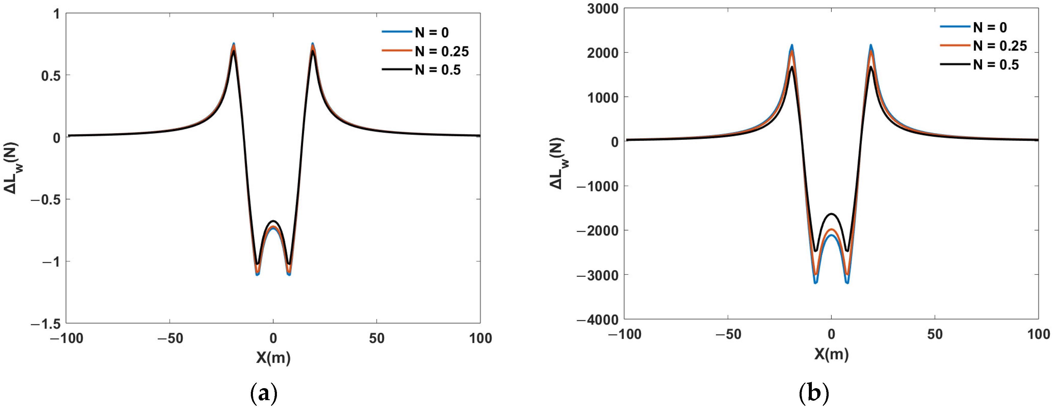 X-axis, the lift changes rapidly within the range of X = 0 m to X = 35 m, particularly at X = 14 m, where the lift changed from negative to positive. Within this range, the roll risk for the following aircraft was relatively high. The maximum positive and negative lift peaked occur at X = 7 m and X = 20 m, respectively. Additionally, the higher the BV frequency, the greater the reduction in the peak values.