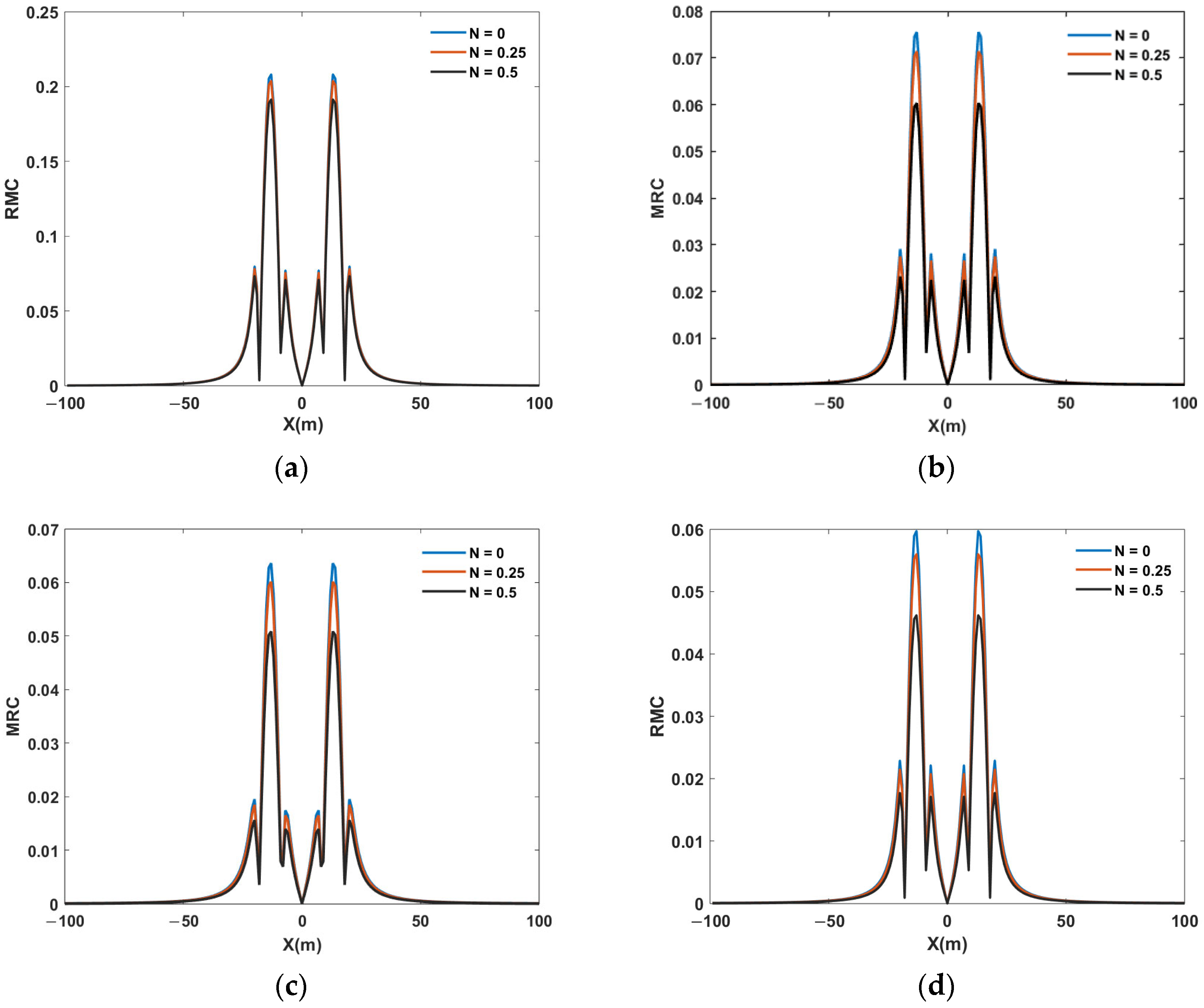Figure 8, the encounter risk of the A321 wake vortex at different times within a 100 m range around the vortex core height was presented. The RMC values for the negative half of the horizontal axis were treated as absolute values. With the dissipation of the wake vortex, the peak value of the wake vortex at different characteristic times decreases. The BV frequency affected the rate of wake vortex dissipation; the higher the BV frequency, the faster the dissipation of the wake vortex strength, resulting in a smaller rolling moment experienced by the following aircraft and a corresponding reduction in the RMC values. When N = 0 and t* = 5.5, the RMC value of the SR20 aircraft reached the preset safety threshold. When N = 0.25 and t* = 5.3, the RMC value also reached the same safety threshold, and when N = 0.5 and t* = 4.9, it again met this threshold. The simulation results under N = 0, 0.25 and 0.5 atmospheric conditions were therefore used as the basis for determining the corresponding safety separations. Based on the A321’s approach speed, the safe separation distance for the following light aircraft SR20 was determined to be 6375 m under N = 0, 6188 m under N = 0.25, and 5700 m under N = 0.5. These were 31.5%, 33.5%, and 38.7% smaller, respectively, than the radar-based wake vortex separations prescribed in the current regulatory document CCAR-93TM-R6. Compared to the RECAT-EU standards, the reductions were 31.2%, 33.2%, and 38.4%, while compared to the RECAT 1.5 standards, the reductions were 13.9%, 16.5%, and 23.1%.