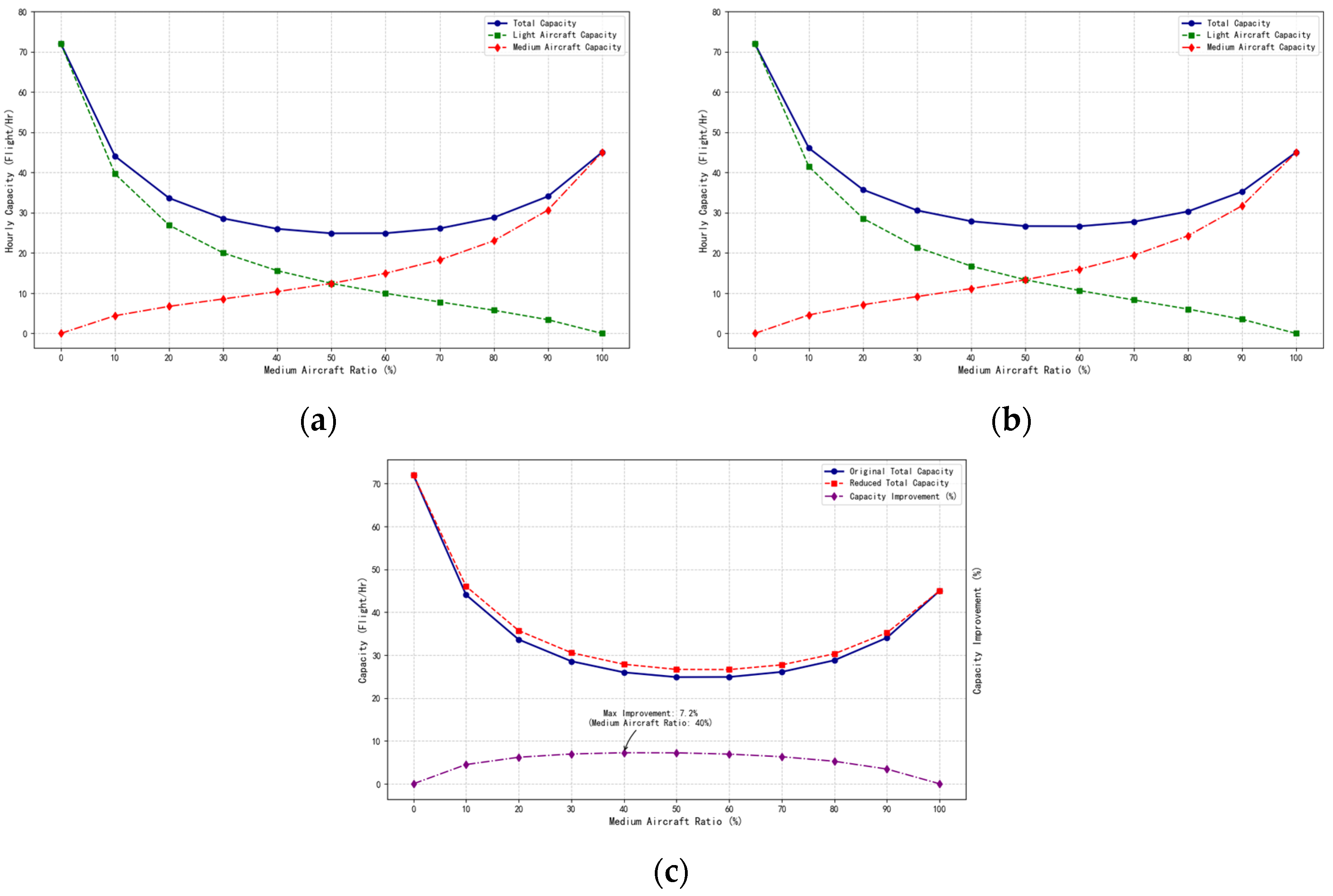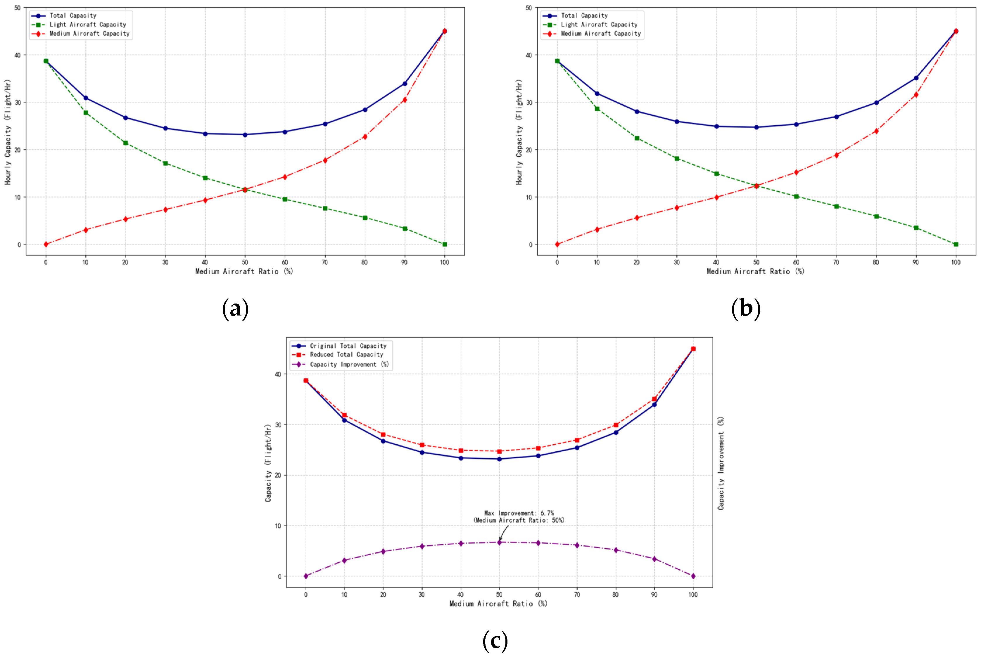Figure 9. This was because the approach and landing time interval for VFR training was much smaller than that for IFR training. Under the current regulatory separation standards, the maximum runway capacity of 72.00 movements per hour was only achieved during training flights. As the proportion of medium aircraft in civil aviation transport increased, the average runway service time also increased, causing a rapid decrease in runway capacity. When the proportion of medium aircraft reached 20%, the runway landing capacity was reduced to only 46.7% of the capacity for light aircraft during training flights. With the continued increase in the proportion of medium aircraft, the minimum capacity was reached at 24.87 movements per hour when the proportion reaches 50%, and then gradually increases, reaching 45.00 movements per hour when only medium civil transport aircraft were operating.
