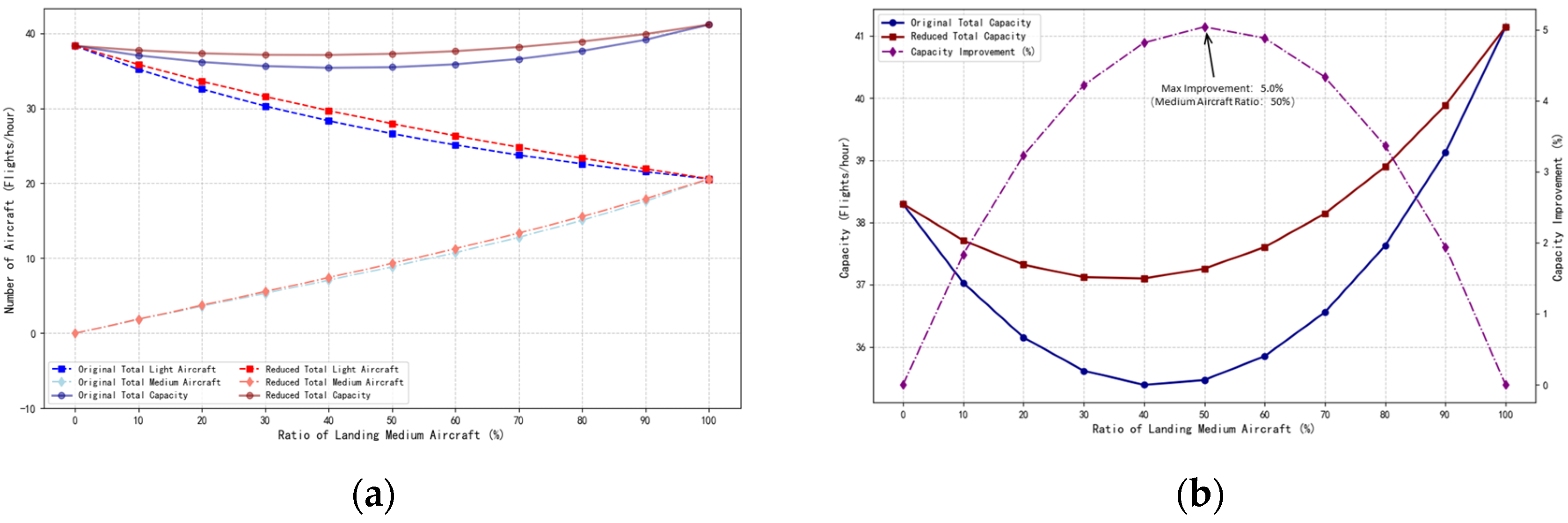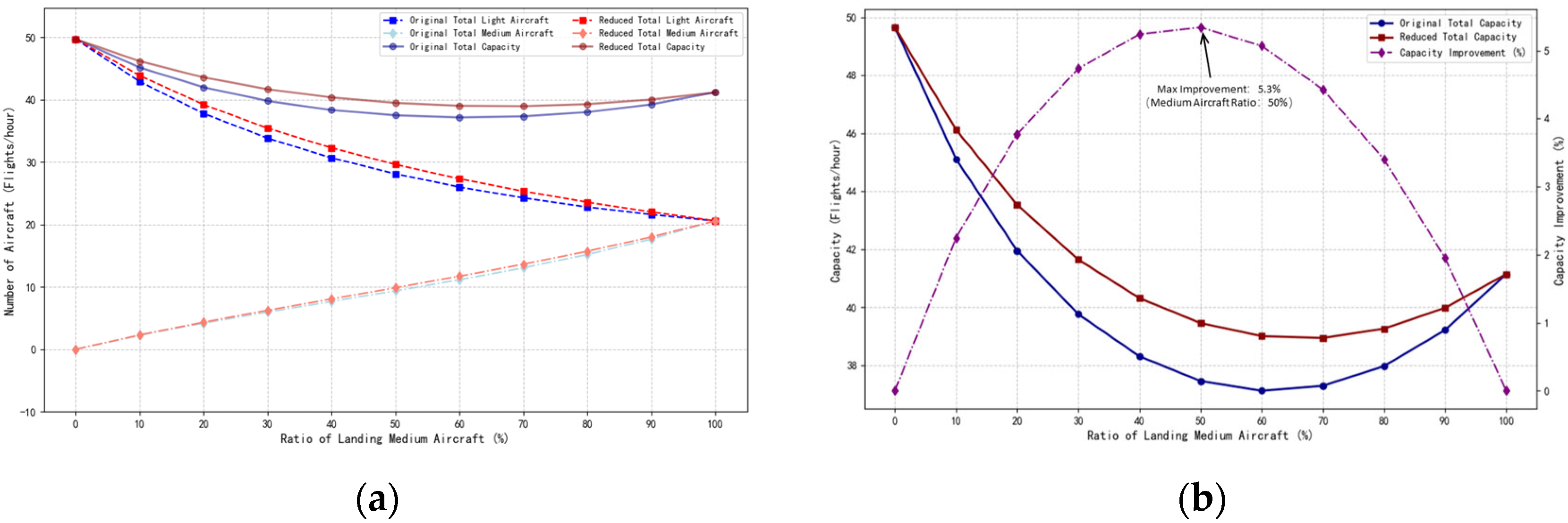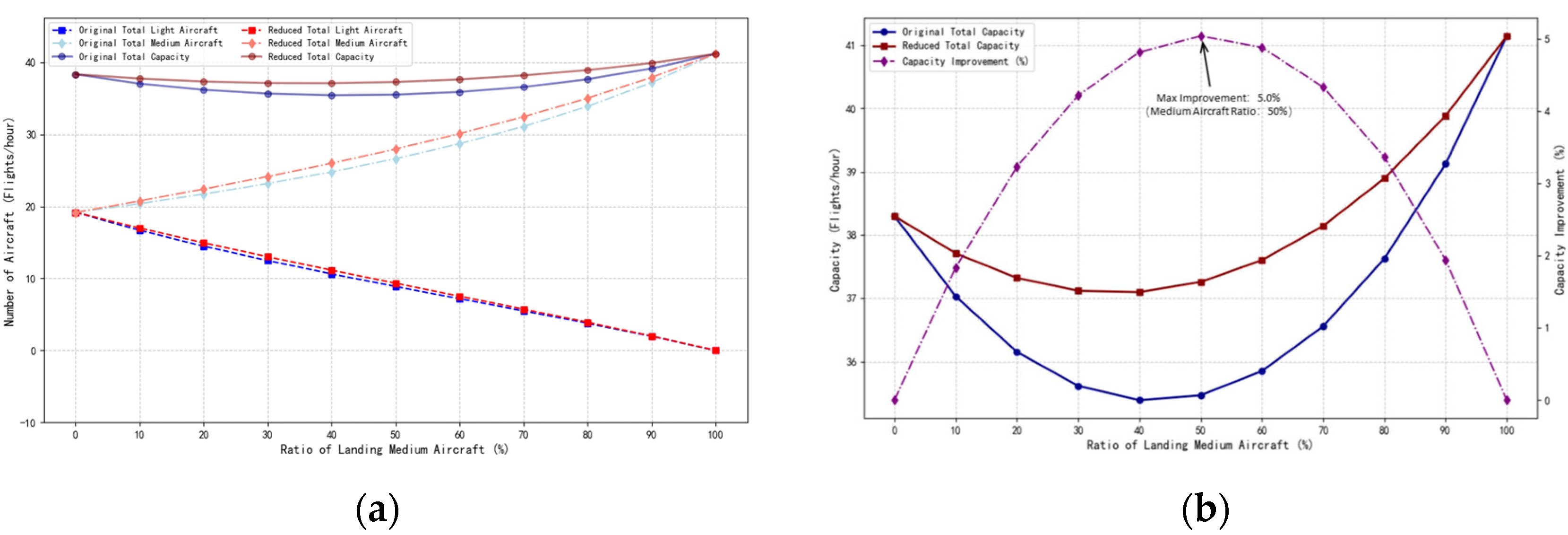 Figure 11, when the takeoff aircraft was a light aircraft operating under VFR, and only light aircraft were conducting training flights, the separation between the two aircraft was small, allowing the runway to efficiently handle the takeoff and landing of light aircraft. The total takeoff and landing capacity was 49.66 movements per hour. As the proportion of medium aircraft increased, the runway capacity slowly decreases. When only medium aircraft were in operation for continuous interleaved takeoffs and landings, the total capacity was 41.14 movements per hour. Under the wake vortex encounter safety separation conditions, the total capacity increased by a maximum of 5.3% when the proportion of medium aircraft reached 50%.