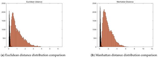 A certain overlapping region exists between two consecutively captured point clouds, and searching for matched-point pairs based on the overlapping region is the basis for point-cloud registration. The feature vector obtained by 2D wavelet decomposition reflects the texture characteristics of the partial region of the pavement, which we use as an index to find matched-point pairs, specifically expressed as follows: the points that show a certain degree of similarity in the feature vector are regarded as matched-point pairs in the point cloud of the two consecutively captured frames. In order to measure the similarity of the feature vectors, Euclidean distance, Manhattan distance, cosine similarity, and similarity coefficient are chosen as the similarity indicators in this study, and when comparing the two feature vectors exhibiting greater similarity, the trend of the four indicators is (1) Euclidean distance close to 0; (2) Manhattan distance close to 0; (3) cosine similarity close to 1; and (4) similarity coefficient close to 1, as shown in Figure 5.