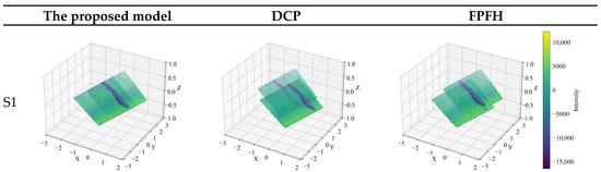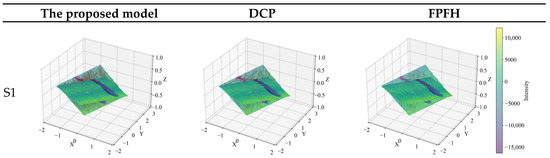 Two mainstream registration baselines were used for comparison: methods based on local feature description and deep learning-based registration methods. The local feature description method calculates the geometric characteristics of each point’s neighborhood to describe its local geometry, establish correspondences, and compute the transformation matrix. The FPFH (Fast Point Feature Histogram) [22] method is chosen for this category. FPFH characterizes local features by analyzing the distribution of normal vectors and curvatures within a point’s neighborhood, offering high computational efficiency and strong noise robustness. For deep learning-based methods, the Deep Closest Point (DCP) [23] method is selected. DCP integrates the traditional iterative closest point (ICP) algorithm with deep learning to address issues such as ICP’s susceptibility to local minima and sensitivity to initial values. By learning deep features of the point cloud, DCP establishes more robust correspondences, enabling more accurate point-cloud registration. In the experiment, the parameters for PointNet, used within DCP, are derived from pre-training on the SemanticKITTI dataset [24].