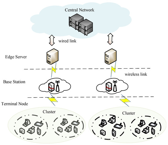 The network model of this paper is shown in Figure 1. This model consists of a central network, edge servers, base stations, and terminal nodes. The central network belongs to the cloud layer, the edge servers and the base stations belong to the edge layer, and the terminal nodes belongs to the end layer. In this model, a one-to-many mapping relationship exists between the core cloud and edge servers, and between edge servers and terminal nodes. Base stations are responsible for the allocation and management of wireless communication resources for terminal nodes. Terminal nodes access edge servers via base stations, while edge servers connect to the core cloud through high-bandwidth, low-latency wired links (such as optical fibers), thereby ensuring reliable and efficient access to central network services for all terminal devices.