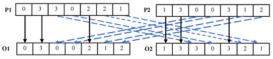 F is the scaling factor, which is regarded here as the probability of executing (14), denoting the heteroscedastic operation. ⊕ represents the XOR operation. The execution rule of ∗ is as follows: for each binary bit of each gene, generate a random number between ; if , then execute Equation (14). The opposite is not executed. The mutated binary number is converted back to an integer to obtain the final mutated individual. After generating the mutated individual, for each of its genes decide whether to replace the target individual with the value of the mutated individual based on the crossover probability .