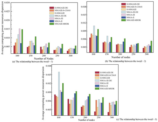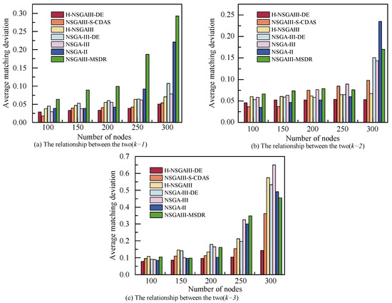 When , the average matching deviation increases most significantly across all algorithms. For , with and , the average matching deviation of the proposed algorithm is marginally higher than that of NSGA-II and NSGAIII-S-CDAS, indicating potential for further improvement in resource utilization efficiency under these specific scenarios. However, in the majority of other cases, the proposed algorithm demonstrated optimal resource conservation characteristics. Its average matching deviation exhibited the smallest increase with a growing number of nodes and also recorded the lowest absolute value, effectively curbing computing power waste. The results confirm that the proposed method can significantly reduce redundant resource allocation while scaling cluster size, thereby enhancing resource utilization efficiency.