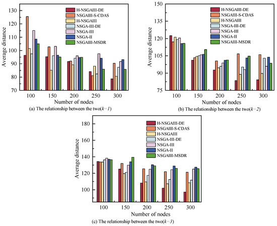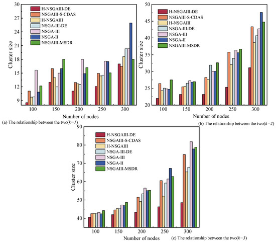 When and , the cluster size of the proposed algorithm is slightly higher than that of NSGA-III-DE algorithm, indicating that there is some room for improvement. However, when k increases to two and three, the proposed algorithm demonstrates a marked advantage in cluster size control, with values significantly lower than the comparative algorithms. This result indicates that in scenarios with large node scales, the proposed method can more effectively reduce the number of redundant nodes. Consequently, it achieves a more compact cluster structure while maintaining system performance and improving resource utilization efficiency.