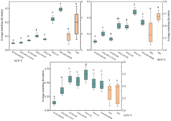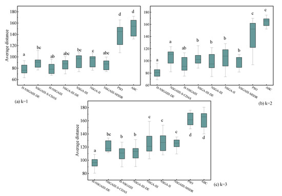 The statistical results presented in Figure 11, Figure 12, Figure 13 and Figure 14 lead to the following conclusions: Under the specific scenario of cluster number k = 1, the improved algorithm proposed in this paper shows no statistically significant difference in the average distance (D) and average matching deviation (A) metrics compared to the current best baseline algorithm, NSGAIII-S-CDAS. However, in all other tested scenarios and metrics, the performance of the H-NSGAIII-DE algorithm consistently and stably exhibits statistically significant differences compared to the other algorithms. It is particularly noteworthy that when the cluster number increases to k = 3, the proposed algorithm demonstrates the most pronounced significant differences and the most outstanding performance advantages across all objective functions compared to the other algorithms. This series of statistical test results robustly confirms that the proposed algorithmic improvements not only yield observable performance enhancements but are also grounded in solid statistical significance, thereby validating the effectiveness and superiority of the H-NSGAIII-DE algorithm in solving this category of optimization problems.