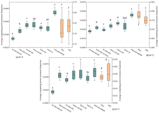 Box plot of average computing power resources dispersion (Different letters indicate statistically significant differences between the two algorithm groups, while the same letter indicates no significant difference. If a group is assigned multiple letters from other groups, it signifies no significant difference with those respective groups. A unique letter for a group indicates a statistically significant difference from all other compared algorithms).