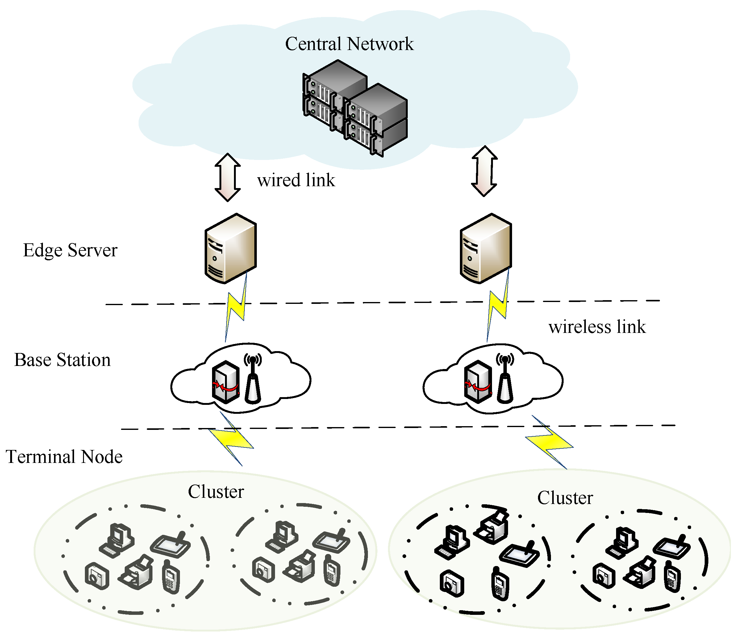 Figure 1. This model consists of a central network, edge servers, base stations, and terminal nodes. The central network belongs to the cloud layer, the edge servers and the base stations belong to the edge layer, and the terminal nodes belongs to the end layer. In this model, a one-to-many mapping relationship exists between the core cloud and edge servers, and between edge servers and terminal nodes. Base stations are responsible for the allocation and management of wireless communication resources for terminal nodes. Terminal nodes access edge servers via base stations, while edge servers connect to the core cloud through high-bandwidth, low-latency wired links (such as optical fibers), thereby ensuring reliable and efficient access to central network services for all terminal devices.