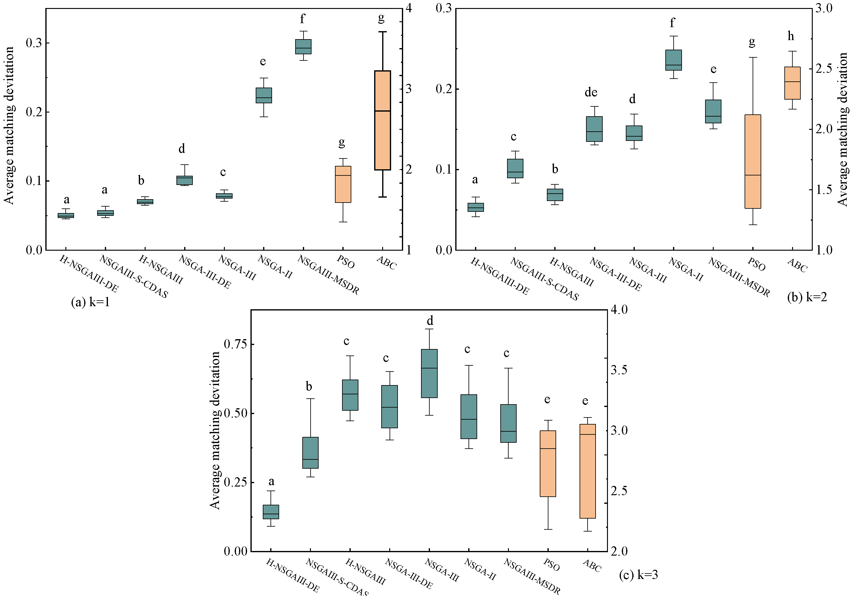 Box plot of average matching deviation (Different letters indicate statistically significant differences between the two algorithm groups, while the same letter indicates no significant difference. If a group is assigned multiple letters from other groups, it signifies no significant difference with those respective groups. A unique letter for a group indicates a statistically significant difference from all other compared algorithms).