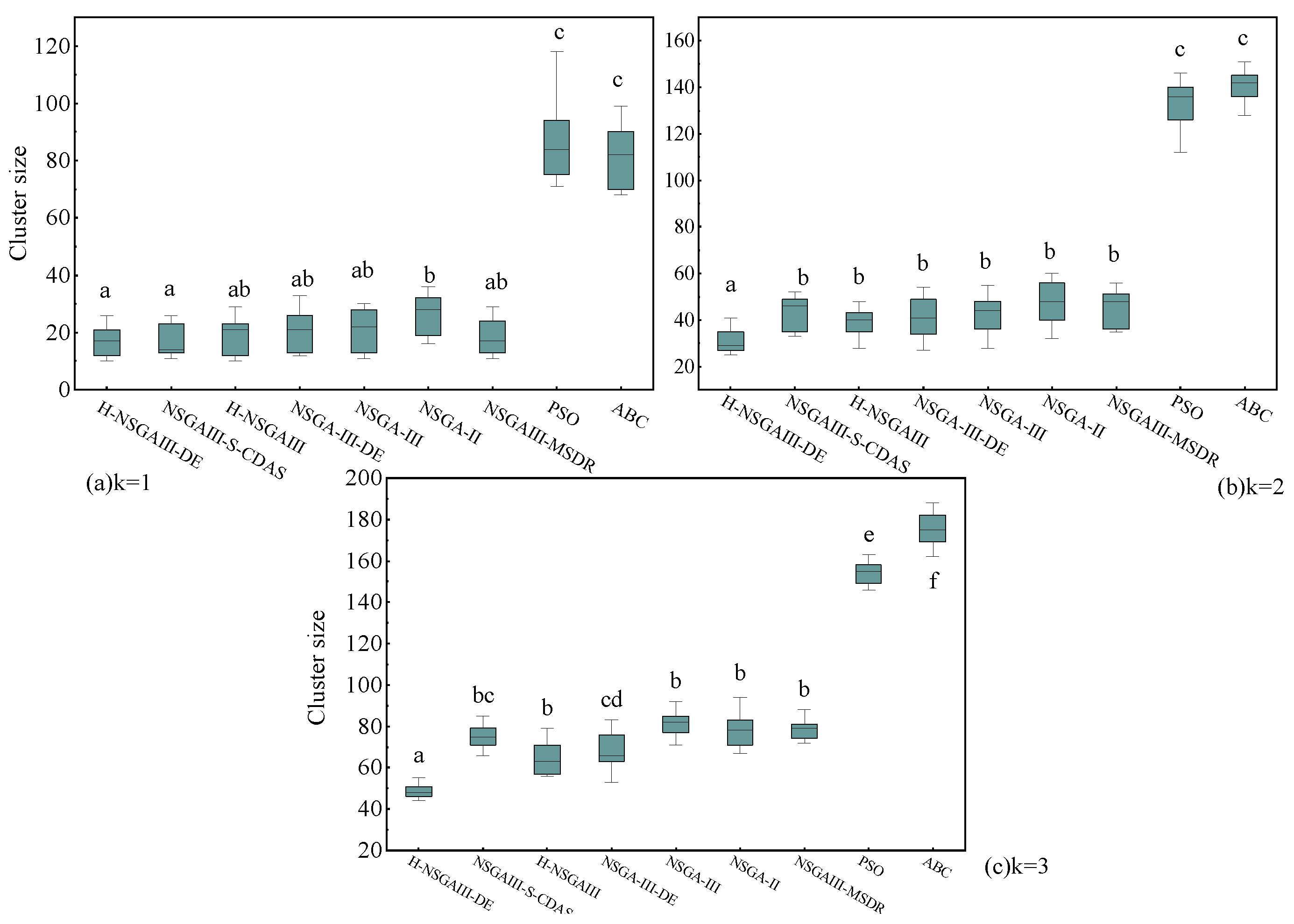 Box plot of cluster size (Different letters indicate statistically significant differences between the two algorithm groups, while the same letter indicates no significant difference. If a group is assigned multiple letters from other groups, it signifies no significant difference with those respective groups. A unique letter for a group indicates a statistically significant difference from all other compared algorithms).